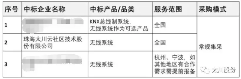 2018年采筑组织万科、泰禾集团发起的智能家居联合招标,目前已经定标。合作期限自2018年3月31日起至2020年4月30日,具体中标单位及产品信息如下: