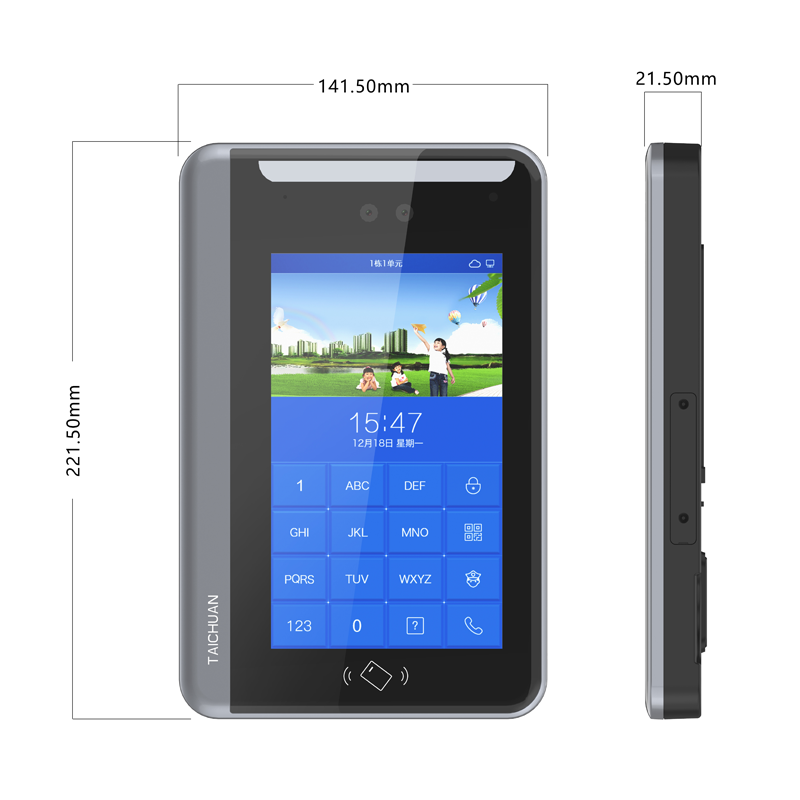 产品参数 系统 Android 屏幕 7寸 操作方式 电容触摸屏 分辨率 600x1024 摄像头 200万高清宽动态彩色摄像头/抗逆光/补光灯 通讯方式 TCP/IP 接口 电源与开锁、RJ45 SDK 提供二次开发SIP SDK 工作电压 DC12V/1.5A 安装方式 桌面摆放 人脸识别 高速人脸识别/支持活体/2万+人脸库 门禁卡 IC卡 外观尺寸 142*222*24mm 材质 钢化玻璃+ABS 安装方式 壁挂安装